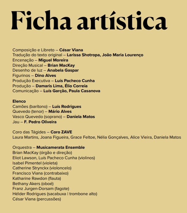 Partimos, pois, para este desiderato de um texto ainda inédito em português e que constitui, ele próprio, testemunho da enorme influência de Camões na literatura e na arte europeia e mundial – a pequena tragédia “Camões”, de Vassili Jukovski, escrita em março de 1839 (extrapolada de obra homónima “Camoens”, de Friedrich Halm, de 1837). Encomendámos este monumental trabalho ao compositor César Viana, professor no Centro Superior Katarina Gurska, em Madrid e antigo membro do Conselho de Administração do OPART (organismo gestor do Teatro Nacional de São Carlos, em Lisboa). O elenco, conta com grandes artistas do meio operático português.