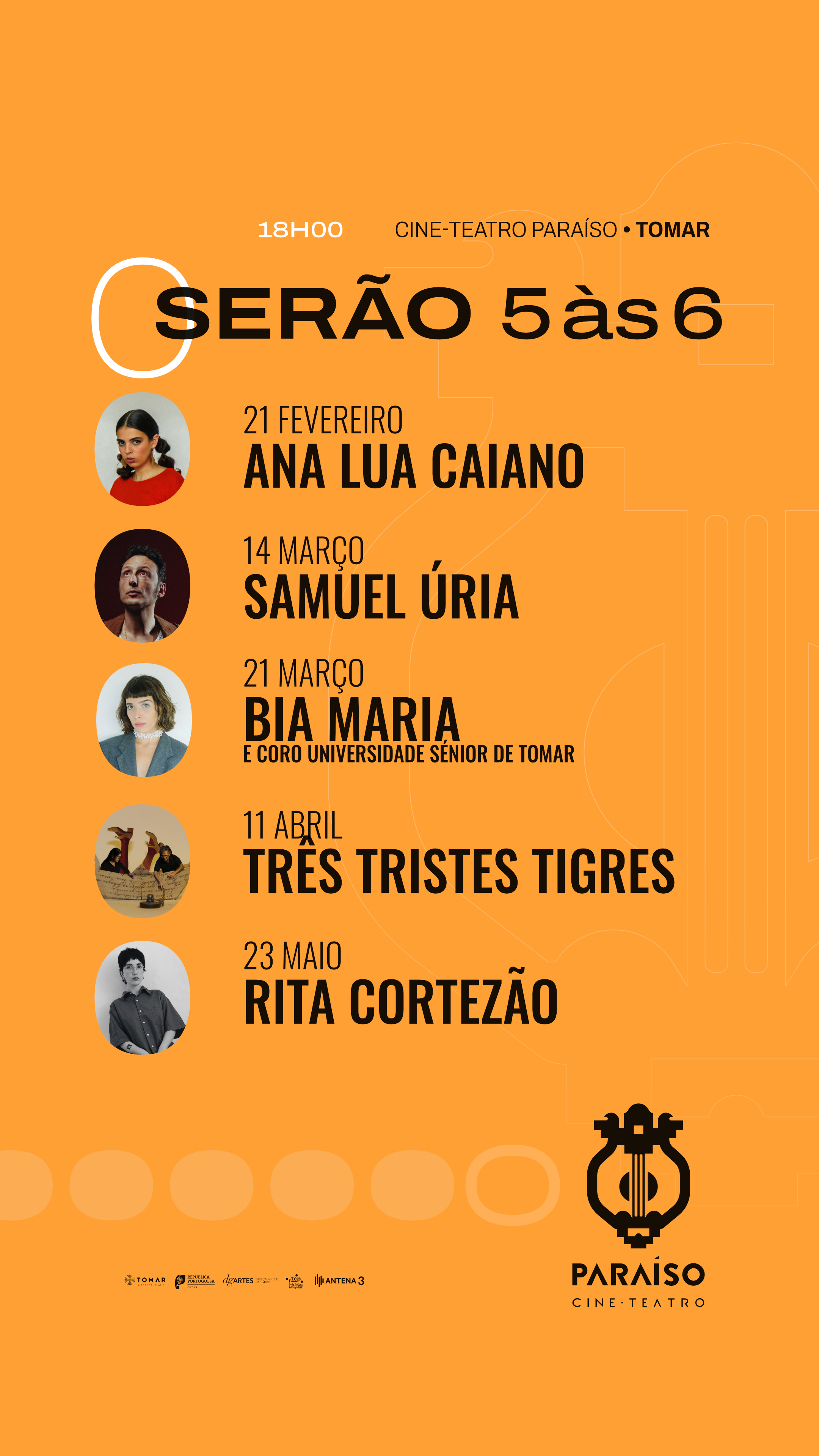 Um ciclo que integra 5 nomes com trajetos díspares e a exploração de sonoridades também distintas, embora os seus álbuns possam estar, perfeita e harmoniosamente, juntos na mesma pasta. Nomes consagrados e que enchem auditórios, banda com mais de 30 anos e que rompe com qualquer linguagem comercial, artistas que há pouco tempo eram emergentes e agora são premiadas, nacional e internacionalmente, e ainda uma compositora estreante. O Cine-Teatro Paraíso dá o mesmo palco a Bia Maria, Ana Lua Caiano, Samuel Úria, Três Tristes Tigres e Rita Cortezão; os nomes que integram o cartaz deste primeiro ciclo Serão 5 às 6.
