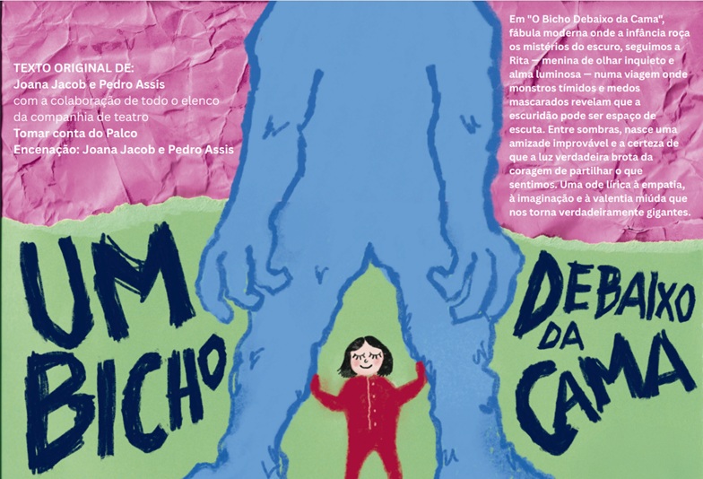 Sob a penumbra do quarto da Rita, onde a imaginação dança com sombras, “Um Bicho Debaixo da Cama” revela-se como um delicado mergulho no universo das infâncias — seus medos fantásticos, coragens inventadas e sonhos que falam alto no escuro. Entre lençóis e segredos, o palco transforma-se em território mágico, onde o bicho que espreita sob a cama talvez seja apenas o espelho das emoções que ainda não têm nome. É uma jornada sensível e lúdica, onde cada susto vira poesia e cada descoberta, um abraço no coração”.